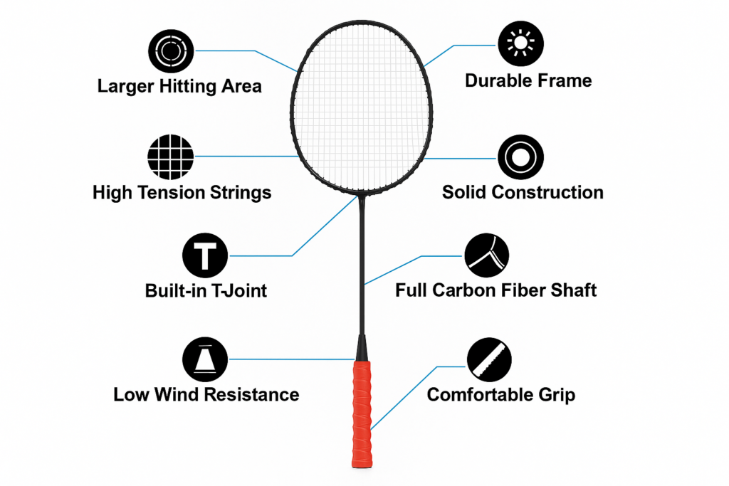 Crafted with a full carbon fiber shaft, each racket offers an optimal balance of strength and weight. Combined with low wind resistance design, players enjoy faster swings and quicker response time—ideal for competitive games.