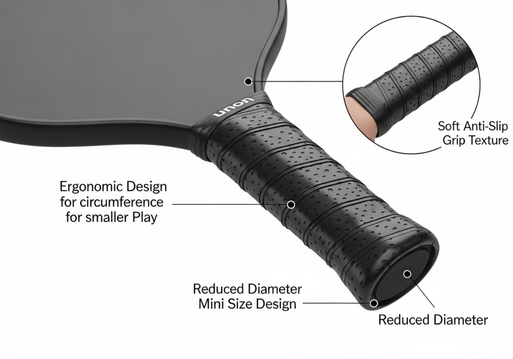 With junior players’ smaller hands in mind, our paddles feature a reduced grip circumference. This ergonomic design ensures a secure hold, allowing young players to maneuver and control the paddle comfortably during every play.