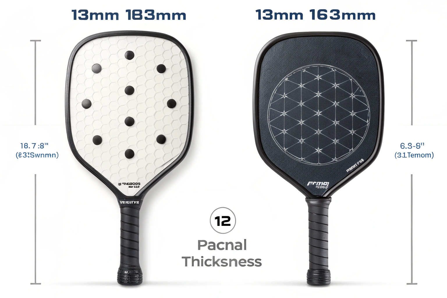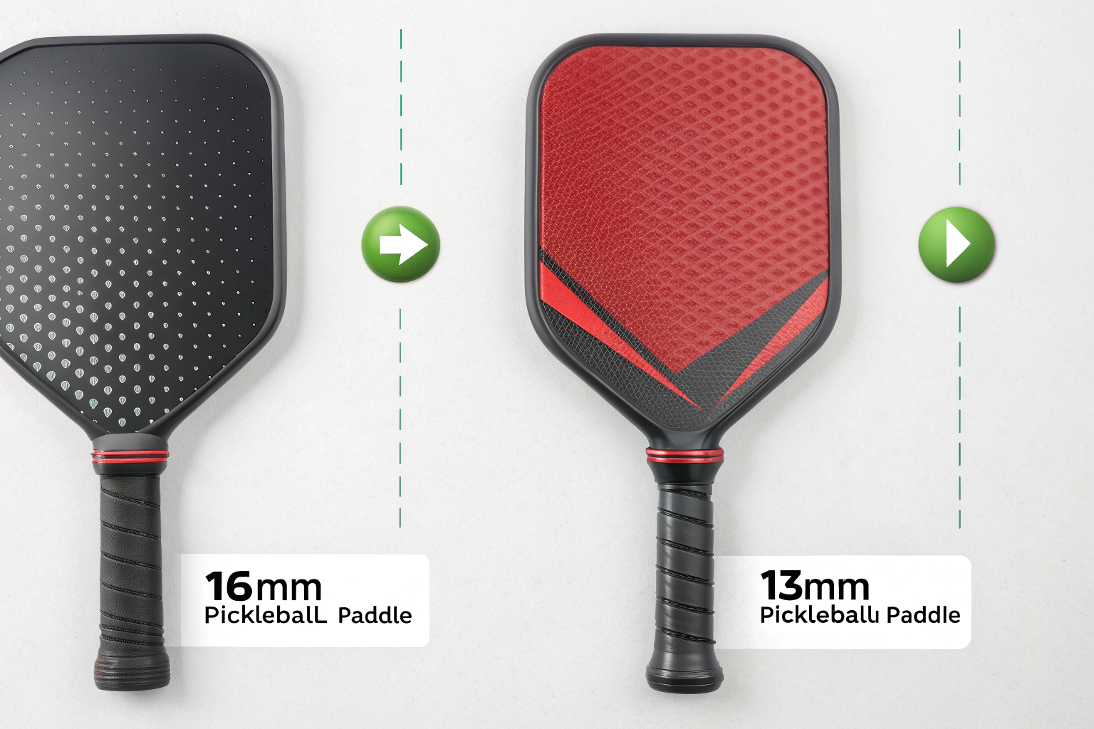 A 13mm paddle is thinner and provides a more responsive, faster feel, while a 16mm paddle is thicker, offering more power and stability. Choosing the right thickness for your style of play and skill level is key to getting the best performance out of your paddle.