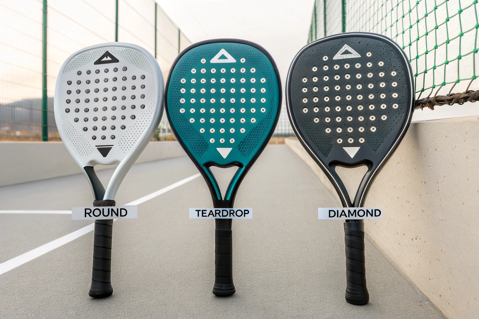 There are three main racket shapes—round, teardrop, and diamond—each designed for a different level and playing style.