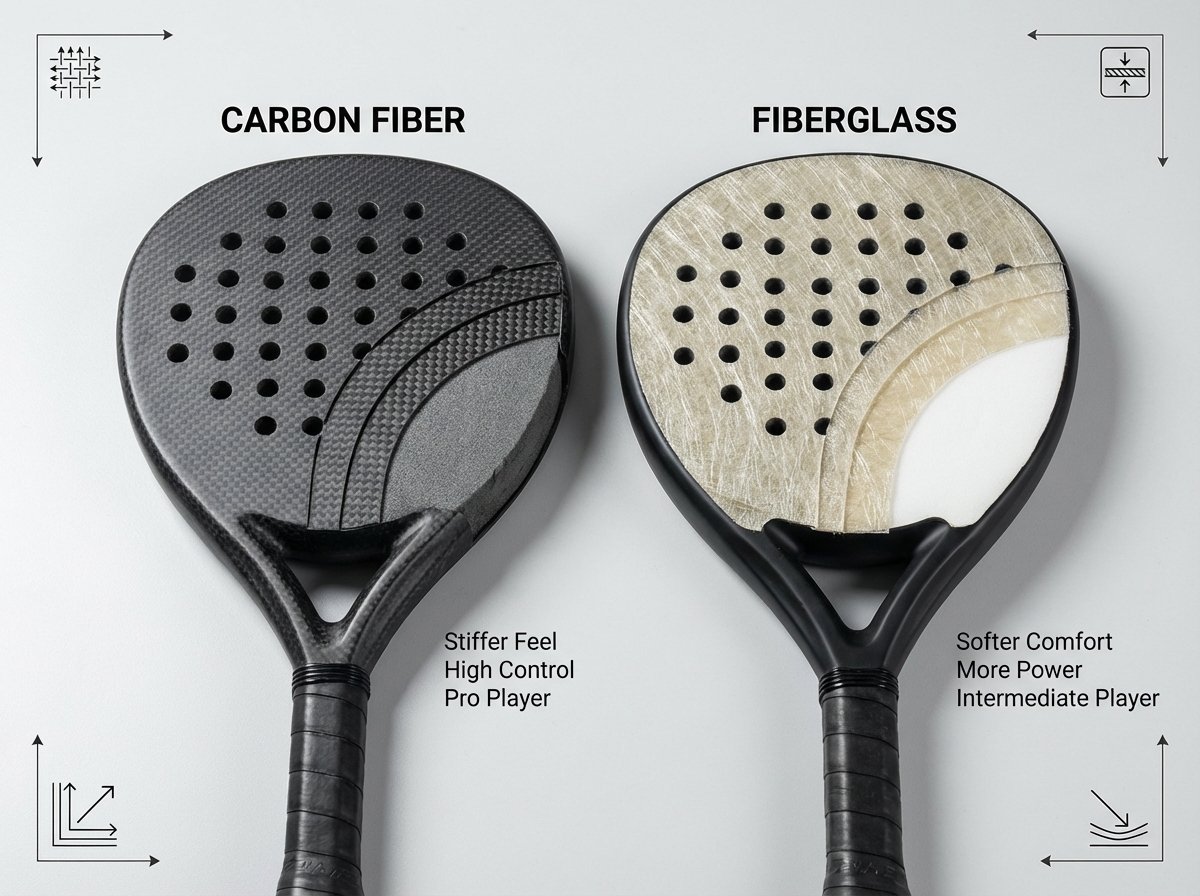 Carbon fiber usually gives a crisper, faster, and more direct response. Fiberglass usually gives a softer, easier, and more forgiving response. Neither material is automatically better in every racket.