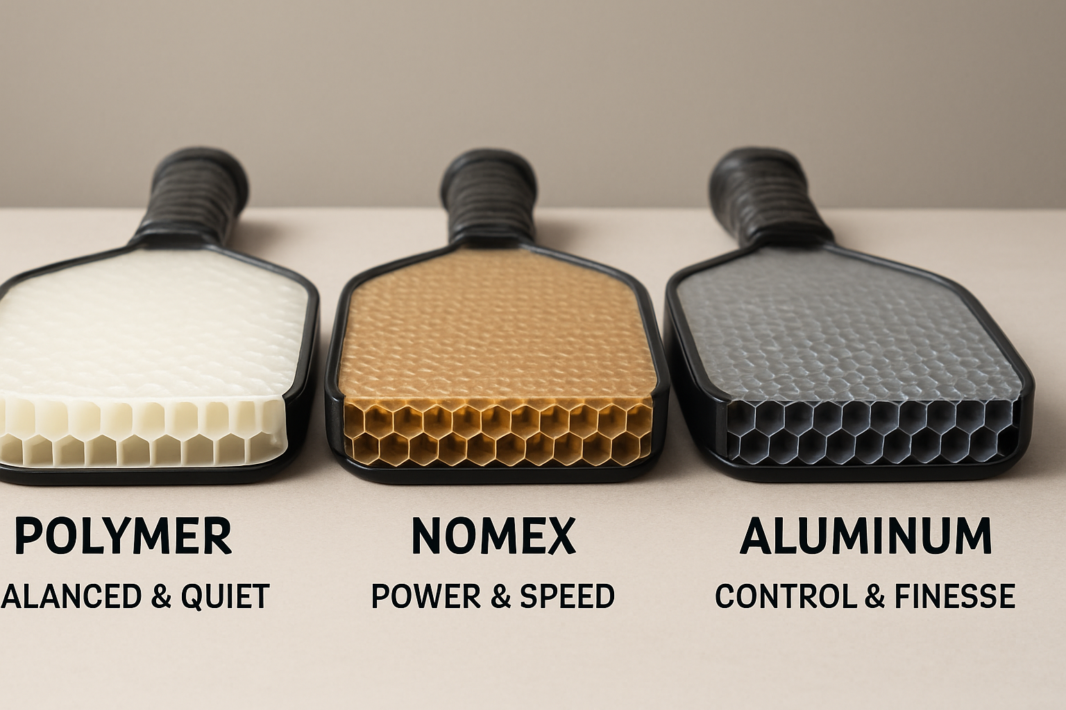 The three common core materials—polymer, Nomex, and aluminum—change paddle weight, vibration, power level, and feel. Each suits a different type of player.